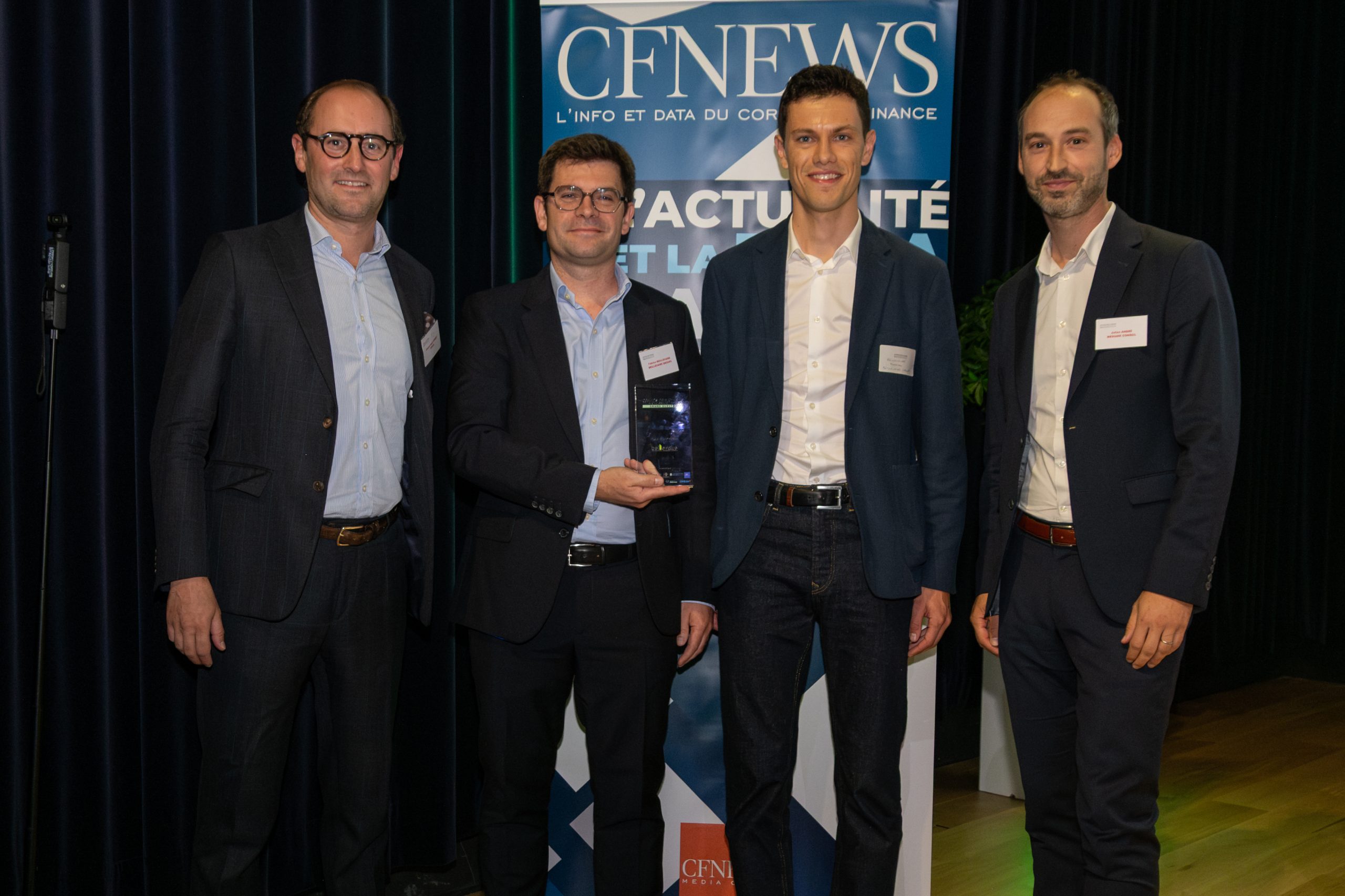 Prix Smid Cap France remis à Fabrice BEILLEVAIRE (au centre gauche), Directeur Général de BEILLEVAIRE GROUPE et à Mathieu BEILLEVAIRE (au centre droit) Fondateur de MILVIES filiale du Groupe par Julien ANDRÉ (à droite), Président de MEDIANE CONSEIL et par Charles-André GUÉDET (à gauche), Directeur Général de OPEGA